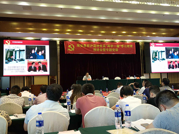 同時,根據縣委組織部對“兩學一做”教育活動的工作安排,“聯(lián)合黨委”于5月19日下午舉行“兩學一做”教育活動專題黨課?!奥?lián)合黨委”書記李忠澤作“兩學一做”動員報告,海安縣委黨校常務副校長徐進、副校長程衛(wèi)國分別作“學習黨章、學習系列講話”專題黨課,海安籍在滬流動黨員近400人參加活動。