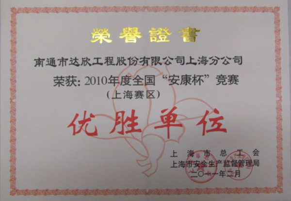 會(huì)上還對(duì)“安康杯”競(jìng)賽活動(dòng)的先進(jìn)集體與個(gè)人進(jìn)行了表彰。第一工程公司“安康杯”競(jìng)賽活動(dòng)工作的有效開展,得到了上海市總工會(huì)、上海市安全生產(chǎn)監(jiān)督管理局、上海市建交委、江蘇省駐滬辦的充分肯定,為此被評(píng)為2010年全國“安康杯”競(jìng)賽(上海賽區(qū))優(yōu)勝單位(受此表彰的外省市進(jìn)滬施工企業(yè)僅此三家),這也是第一工程公司連續(xù)三年獲此榮譽(yù)。