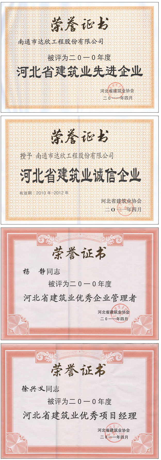 第四工程公司憑著多年的誠信經(jīng)營與良好的企業(yè)聲譽,在本次會議上榮獲多項殊榮:“2010年度河北省建筑業(yè)先進企業(yè)”、“2010-2012年度河北省建筑業(yè)誠信企業(yè)”,楊靜同志榮獲“2010年度河北省建筑企業(yè)優(yōu)秀管理者”,徐興義同志榮獲“2010年度河北省建筑企業(yè)優(yōu)秀項目經(jīng)理”。